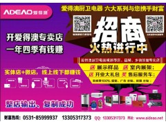 创业想加盟 就要选择有潜力的。 加盟爱得澳厨卫电器 做热水器 净水器专家市场前景无限大 我们主要经营 智能恒温热水器 净水器全系列 智能电动晾衣架 处理器 中高端烟机 灶具 电热水龙头 生态采暖。 加盟爱得澳 可以说是最全的电器专卖,我们的理念是整店式销售一站式购物,经营产品多元化 统一品牌统一形象,8年运作经营。 加盟无费用 投资无限制。加盟爱得澳做真正的事业,自己当老板,公司免费培训各个店老板团队管理能力和店面运营 售前售后服务 等流程,全程指导。如果你开店期间不赚钱我们全额原价现金退货。更独特保证政策,让你创业的路上没有后顾之忧。