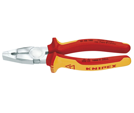 钳口适合夹持扁平和圆形材料 剪切口适合剪切软线,硬线及钢琴线 较长的剪切口适合于剪切较粗的电缆 剪切口附加感应淬火,硬度约为64HRC 由于附加淬火,夹持钳口特别耐磨,其硬度为洛氏硬度53HRC 01 06 160 镀铬双色双重材料绝缘手柄 01 06 190 1000V 经VDE试验