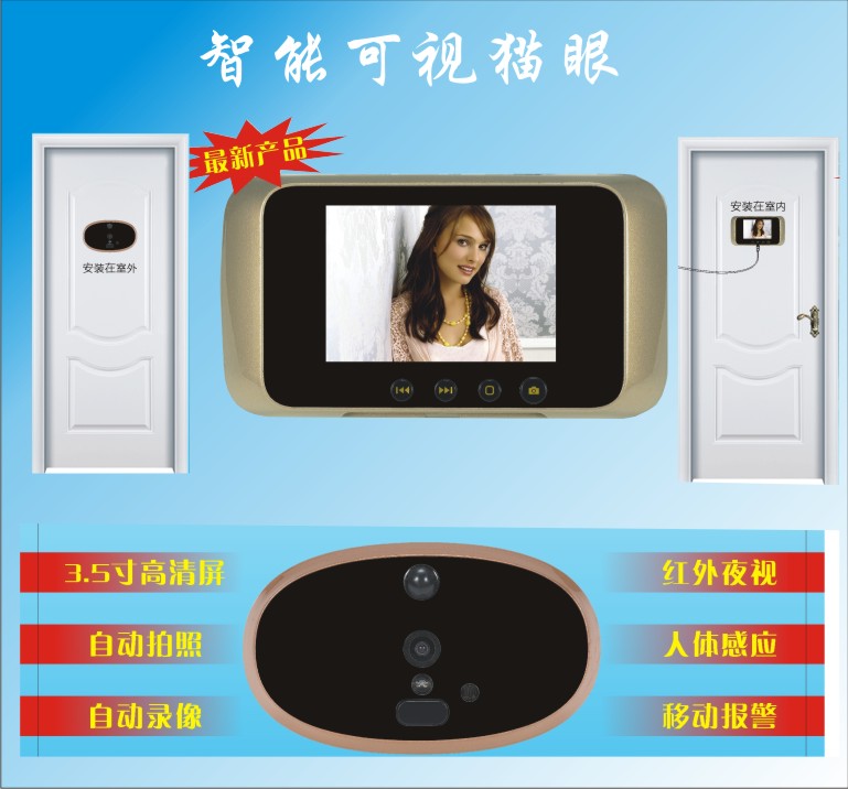 安防鹰豪华型产品主要用于小区居家防盗门上安装、避免小孩、老人、家庭主妇等在家陌生人进入,有人体感应,有人在门外活动声音提示,并拍照或录像记录;门铃铃声可以选择,采用3节5号电池供电;安装方便、美观大方、经济实用。