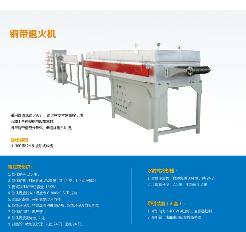 采用管道式退火设计,退火软度容易掌控,适合加工各种规格的焊带基材.可与铜带精密分条机,低速涂锡机对接.