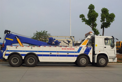 底盘参数:中国重汽前四后八底盘,336马力EGR发动机,平顶单卧驾驶室,尼龙胎,空调,9档变速箱。功能参数联体上装,双卷扬(20吨),两节6边形吊臂,三节托臂,分体式车厢,双侧联动操作装置,也可远距离遥控操作,2个液压绞盘(40米钢丝绳),长排警灯,1个洗手箱,U型抱胎装置,托叉,链钩,后工作灯。